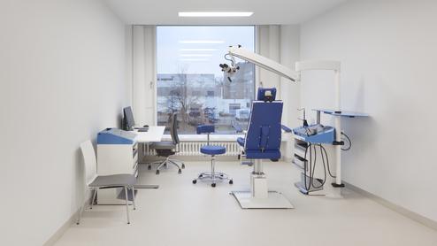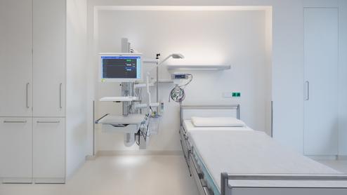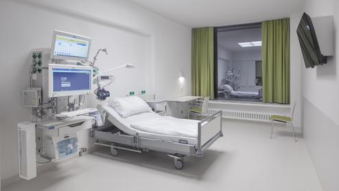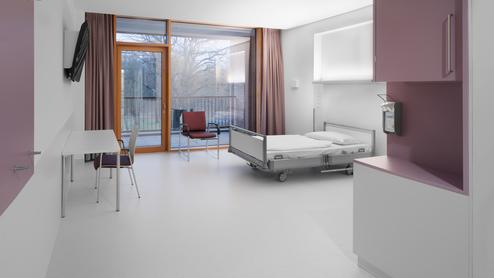 Auf den Stationen Weaning und Neuro-Reha (Phase B) wird durch die kompakte Anordnung von Medizintechnik und Dokumentation auf wandmontierten, vertikalen Medienversorgungseinheiten der Intensiv-Pflege-Charakter des Patientenzimmers auf ein Minimum reduziert.