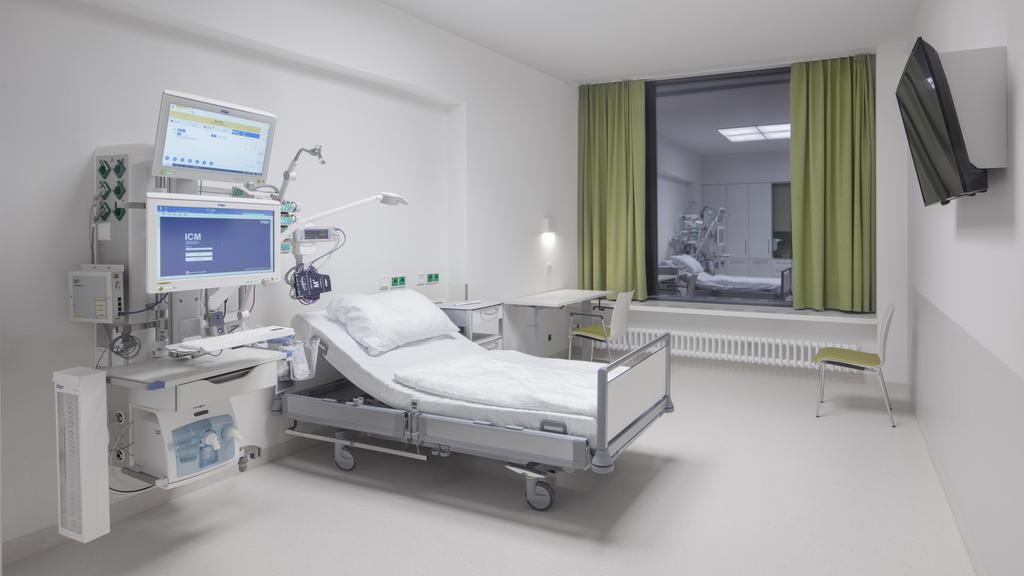 Auf den Stationen Weaning und Neuro-Reha (Phase B) wird durch die kompakte Anordnung von Medizintechnik und Dokumentation auf wandmontierten, vertikalen Medienversorgungseinheiten der Intensiv-Pflege-Charakter des Patientenzimmers auf ein Minimum reduziert.
