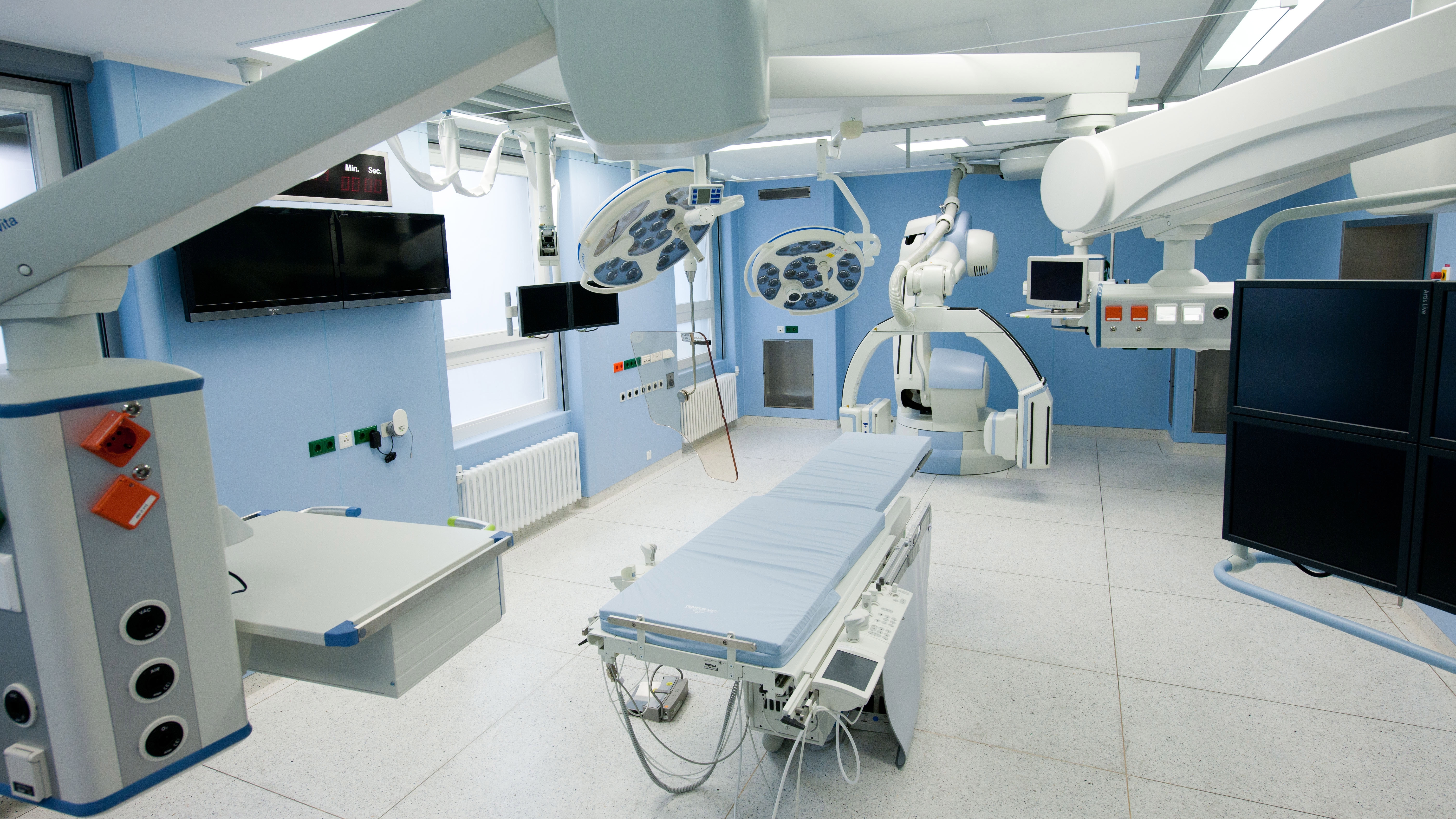 Der vorhandene OP-5 wurde zum Hybrid-OP mit 50m² Nutzfläche umgebaut. Für die benötigte größere Fläche bei Hybrid-Operationen, wurden die Räumlichkeiten des OP-5 und des angeschlossenen Ein-leitungsraumes baulich zu einem größeren OP-Saal zusammengefasst. Der erforderliche Technikraum wurde ein Stockwerk höher, direkt oberhalb des OP-Saals realisiert. Der OP-Tisch des Hybrid-OPs hat die für gefäßchirurgische Eingriffe erforderliche schwimmende Tischplatte und kommuniziert mit dem C-Bogensystem um eine optimale Positionierung beider Systemkomponenten zu gewährleisten. Für die Messung intravasaler und intrakardialer Blutdrücke wurde ein hämodynamischer Messplatz im OP-Saal installiert. Durch die bodengestützte Montage des C-Bogensystems konnte ein Standard-Deckenlüftungsfeld mit einem laminaren Luftstrom über dem OP-Feld realisiert werden. Zur Gewährleistung des uneingeschränkten Klinik-Betriebs während der Umbauphase wurde der Neubau durch Staub- und Schallschutzwände von den restlichen OP-Abteilung getrennt.